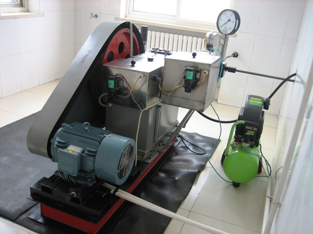 本試壓泵為臥式三柱塞泵,由電動機、皮帶輪、機架、泵頭和底座等組成。