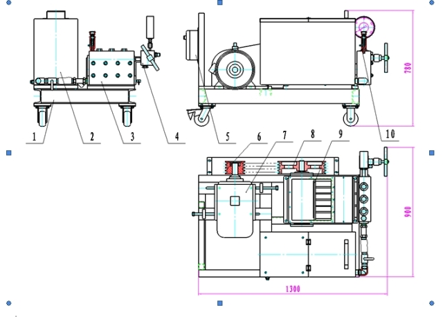 1.機架 2.水箱部分 3.液力端 4.止回卸壓閥 5.電機啟動器