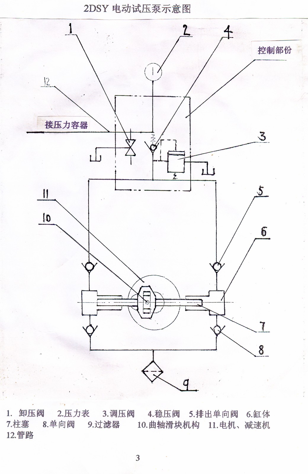 2DSY為臥式雙缸往復式電動試壓泵,由機座、主機、控制部分組成。工作時由電動機通過減速機,驅(qū)動曲軸滑塊帶動兩個柱塞作往復運動,由于兩級單向閥的作用,實現(xiàn)液體的吸入排出加壓,并通過控制部分的調(diào)壓閥、卸壓閥、壓力表自動調(diào)節(jié)顯示恒定系統(tǒng)壓力,試壓結束后松開卸壓閥,系統(tǒng)卸壓。